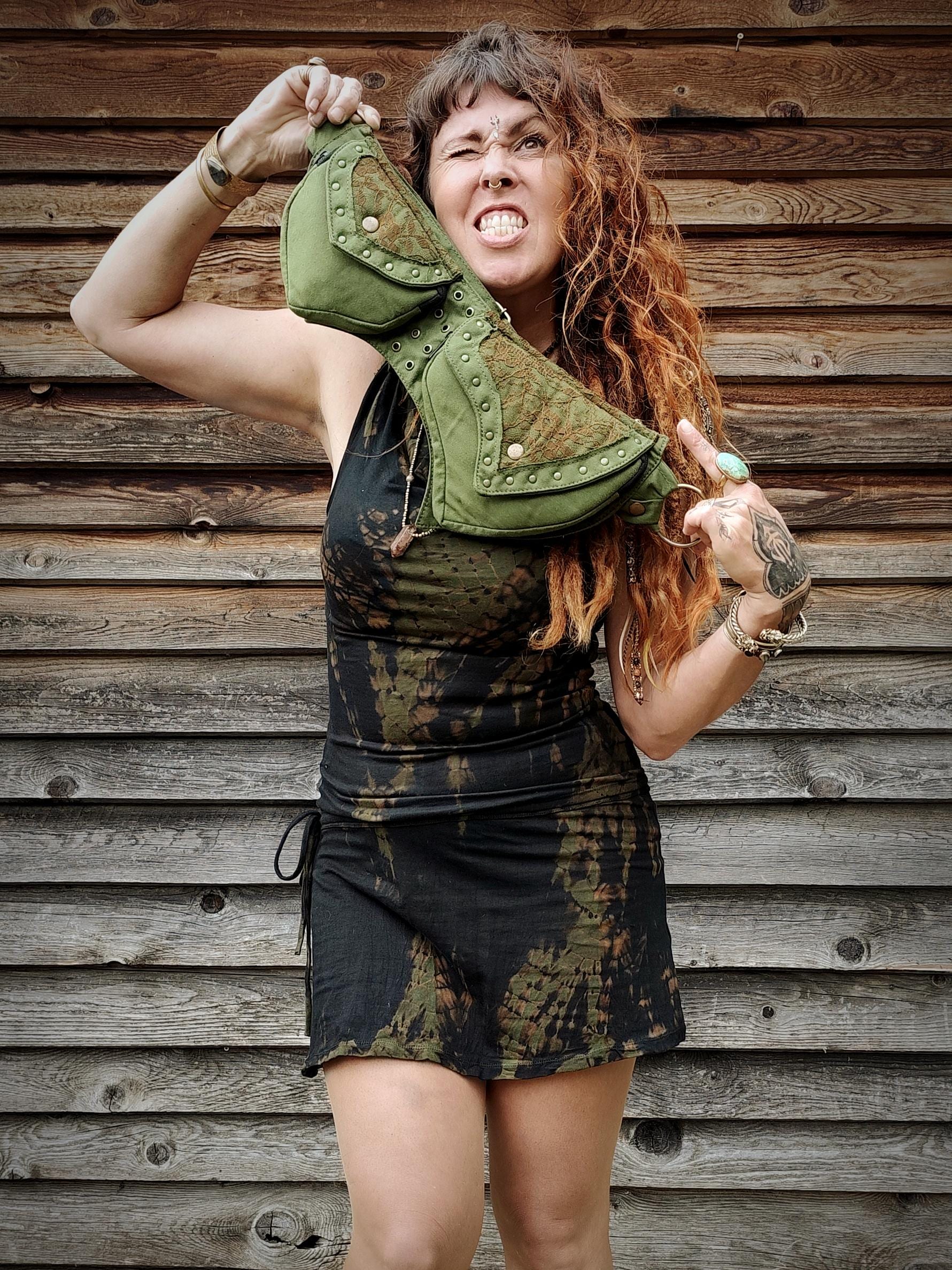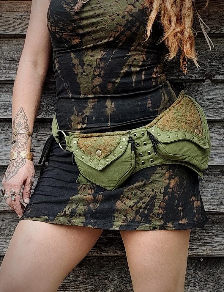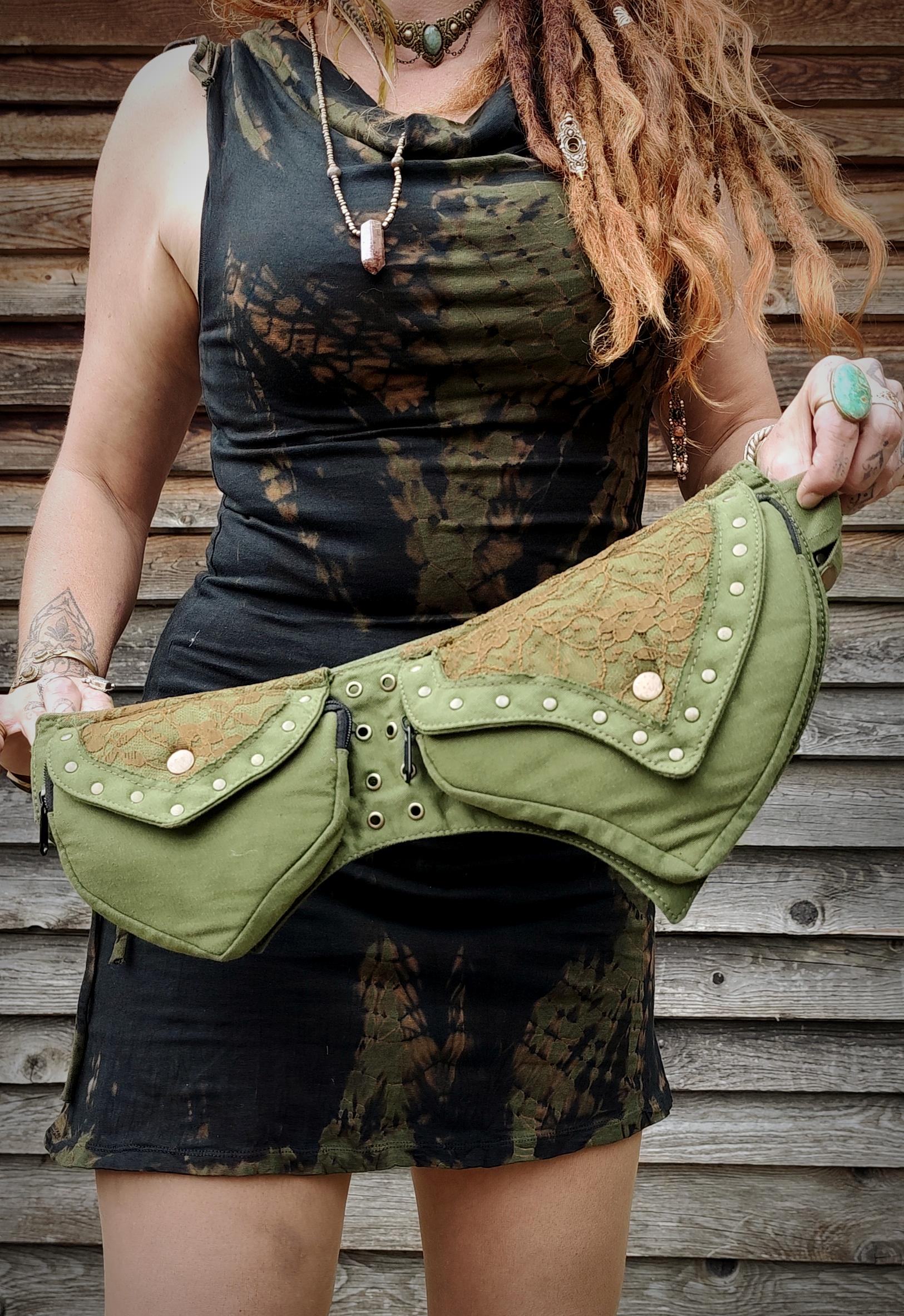 Ceinture sacoche avec plusieurs poches, modèle pour femmes en tissus coton, coupe pointue dans l'esprit féerique fantastique, à taille unique réglable. (voir les dimensions ci-dessous).